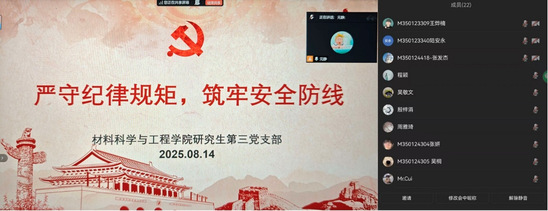 为深入贯彻中央八项规定精神学习教育,进一步增强师生党员的总体国家安全观,守好政治纪律,自觉锤炼党性,材料科学与工程学院党委于8月5日-15日通过党委理论学习中心组学习会和党支部“三会一课”、主题党日等形式开展以“严守纪律规矩,筑牢安全防线”为主题的专题学习。