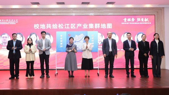 吕颖群和学校党委教师工作部部长、人事处处长张宇清以及2025年学校至松江区跟班学习的赋能专员代表,共绘松江区产业集群地图。